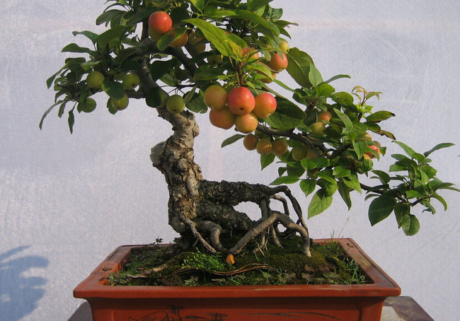 盆栽果樹,可根據(jù)個人的愛好修剪成盆景樹形,注意角度開張,使之通風透光,利于形成花芽,獲得高產(chǎn)。盆栽蘋果控制樹冠要從1年生苗起,以干高相當于盆體高度或高出盆體一倍為宜,采用盤繞式拉枝方式,抑制長勢,促使發(fā)枝。也可對1年生苗木按所需高度進行摘心,促壯主干,再發(fā)新枝。對新發(fā)枝應拉枝培養(yǎng)樹形;對徒長枝、競爭枝,在枝條的5~7片葉間進行扭梢,可有效控制樹體高度,防止徒長,促成花芽;對生長旺的徒長枝和競爭校要充分利用,結(jié)合拉枝進行扭梢、摘心、刻傷、環(huán)剝,可培養(yǎng)大量結(jié)果枝,并促使其形成花芽,達到早結(jié)果、多結(jié)果的目的。當盆栽蘋果進入結(jié)果期時,樹形已基本確立,要根據(jù)品種合理選留枝條,以整個樹冠空間占滿、得到合理利用為宜,有空間的長枝可留作培養(yǎng)新骨架,中、短枝培養(yǎng)為結(jié)果枝組,使樹冠保持穩(wěn)定,做到長短枝相間,葉果比適宜。